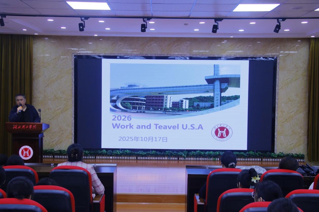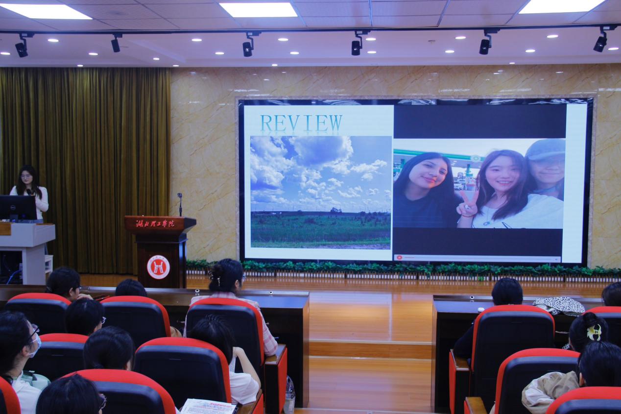 本网消息 为强化学院学生英语实践运用能力,10月17日下午,外国语学院于X2-113室举办“2025年暑期赴美带薪实习报告会”,会议由教研室主任莫代春老师主持,学院党总支书记占赢、副书记易定国出席,访学教师胡婵和赴美实习的两位优秀学生代表进行分享交流,全院150余名学生参会。