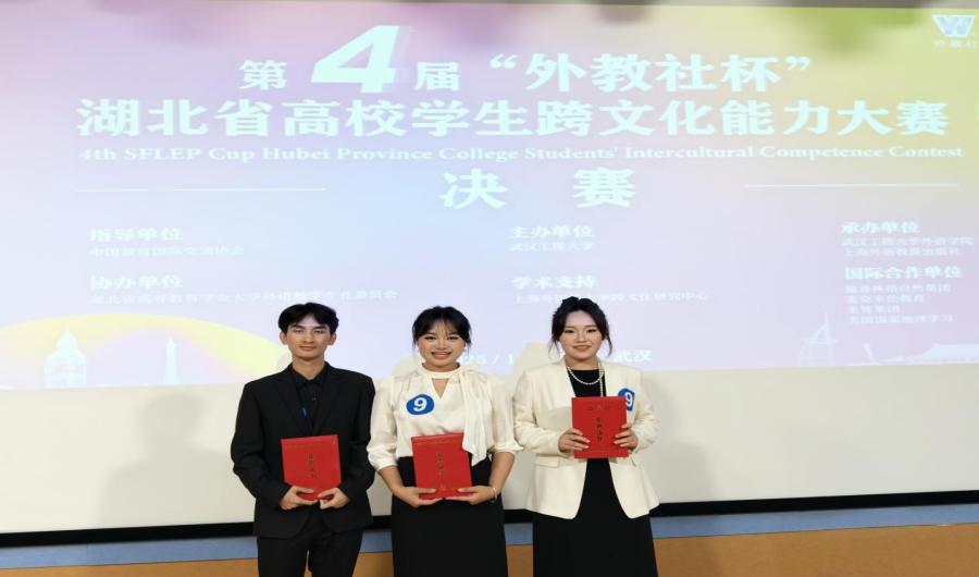 本网消息 2025年10月18日,第四届“外教社杯”湖北省高校学生跨文化能力大赛决赛在武汉工程大学落下帷幕。来自我校外国语学院、新材料与绿色化工学院、经济与管理学院的方彤、吴郦雯、何运三位同学组成的参赛团队凭借出色的跨文化交际能力与扎实的英语应用水平,勇夺省级一等奖。这是我校首次在该项赛事中晋级决赛并斩获最高奖项,标志着我校在跨文化人才培养方面取得重要突破。