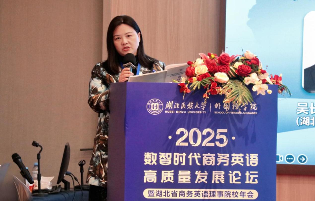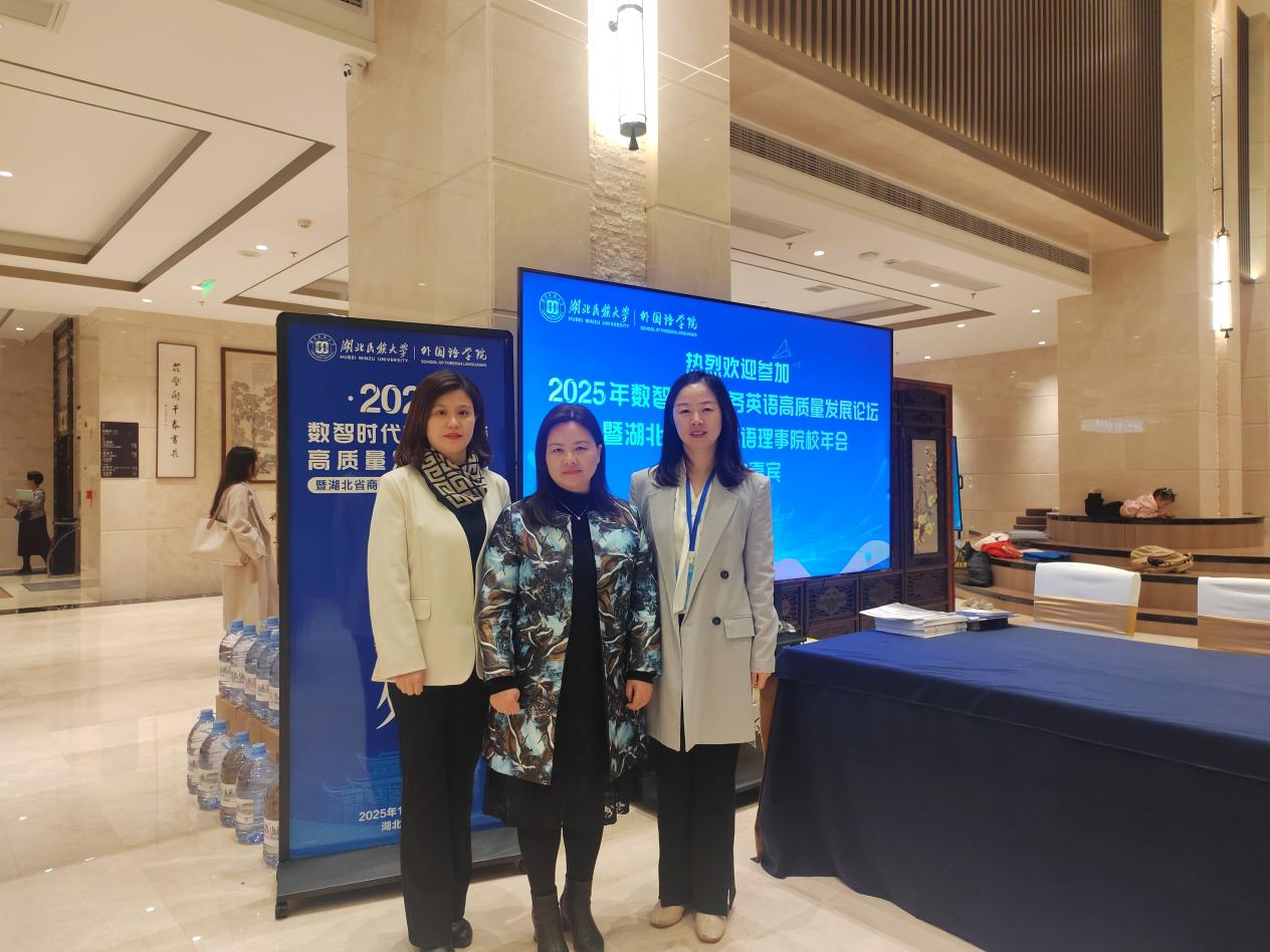 本网消息 11月7日至9日,“2025年数智时代商务英语高质量发展论坛暨湖北省商务英语理事院校年会”在湖北民族大学召开,我校外国语学院院长张健、副院长张嵋琳及商务英语教研室主任邓艳梅应邀参会。三位参会人员参与了会议核心环节,展现学院教研实力。
