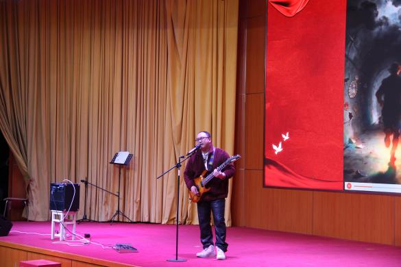 随后,师生们共同呈现了一场别具一格、中外交融的精彩演出。李璐老师深情演唱日语歌曲《また夏を追う》(《再次追寻夏天》),带领观众感受跨越语言的音乐魅力。王建邦老师以一首吉他独唱《A Better Life》,用音乐传递对美好生活的向往。朱敏舟老师演绎法语经典歌曲《我的名字叫伊莲》,歌声优雅动人。占凌轩老师带来的《七里香》,更是勾起了全场师生的青春回忆。