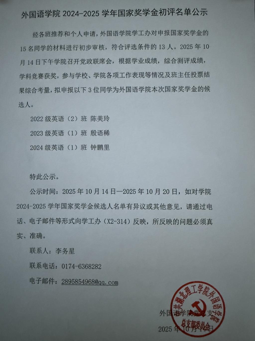 外国语学院2024-2025学年国家奖学金初评名单公示