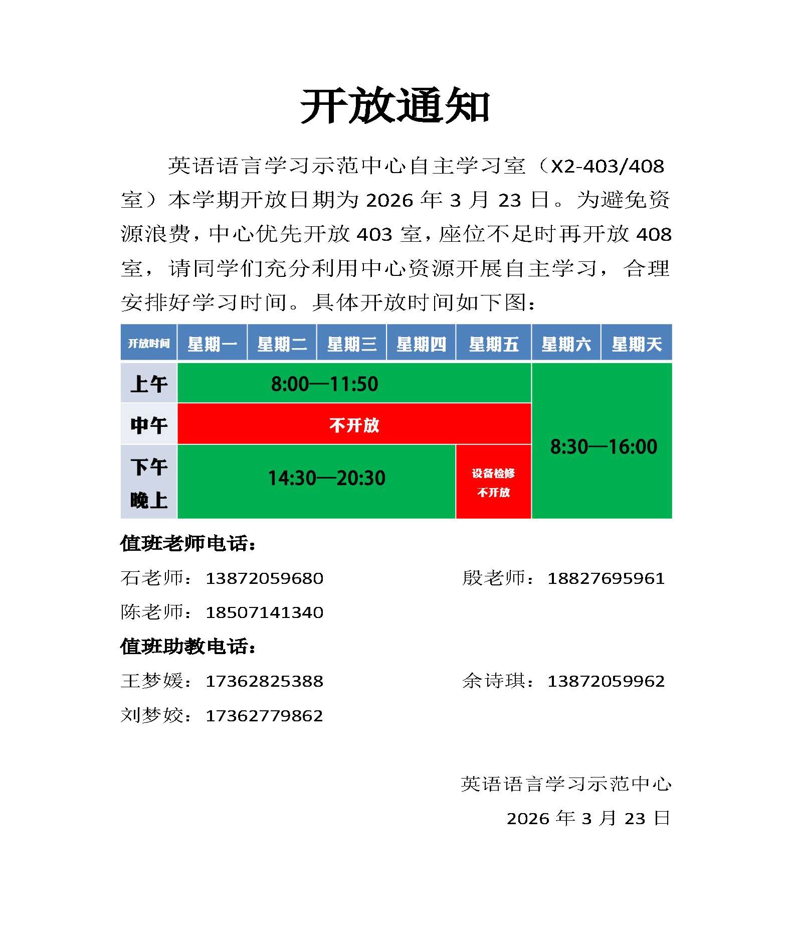 2026年春季自主学习室开放通知