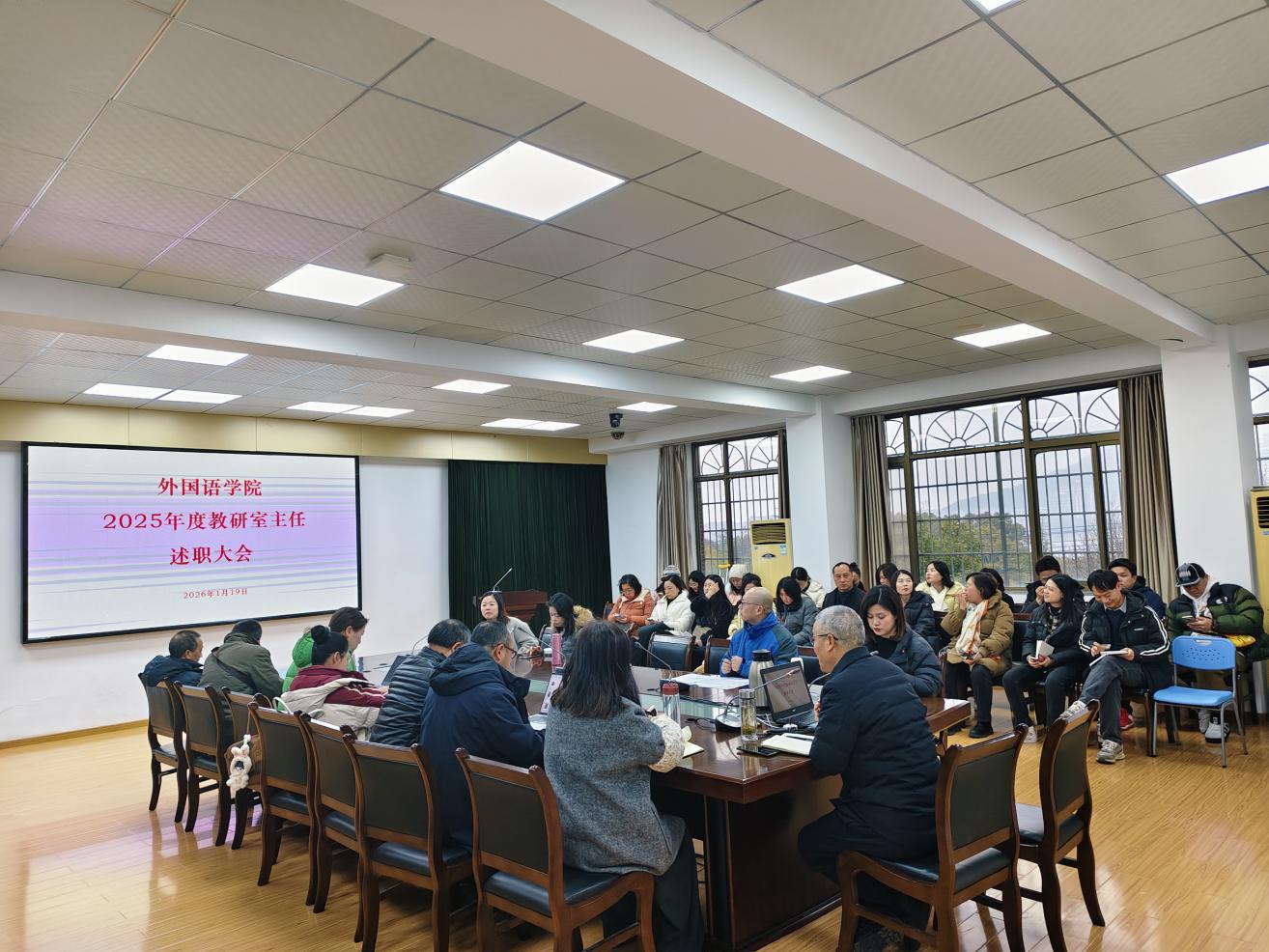 本网消息 1月19日,外国语学院在X2-304室召开2025年党支部书记、教研室主任、博士工作述职会议,4位党支部书记、3位教研室主任以及6位博士进行述职。会议由学院党总支书记占赢主持,全体教职工参加会议。